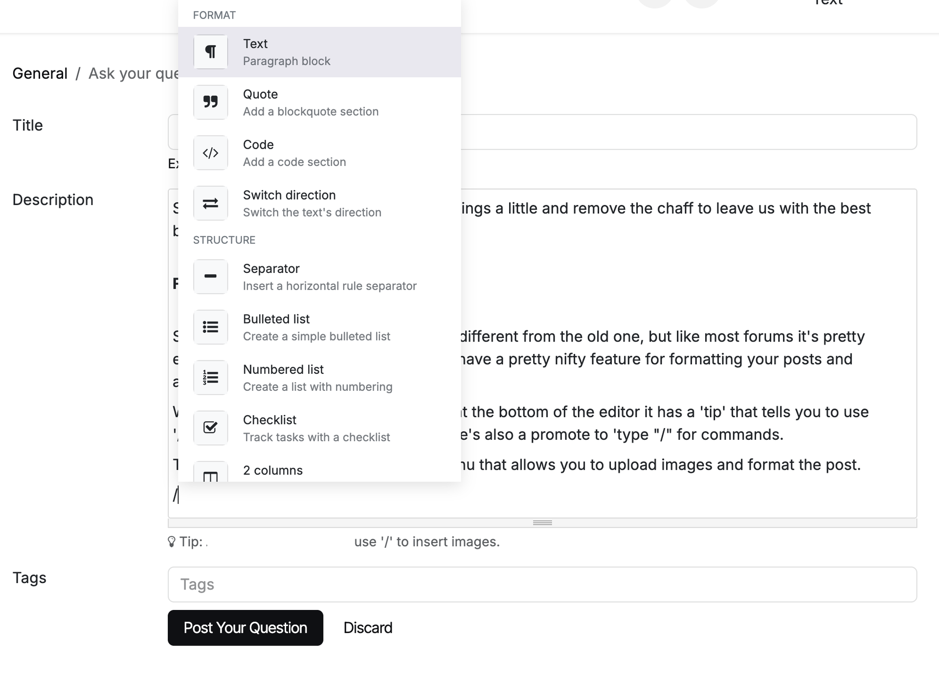 When creating a post you will note that at the bottom of the editor it has a 'tip' that tells you to use '/' to insert images and format text. There's also a promote to 'type "/" for commands.