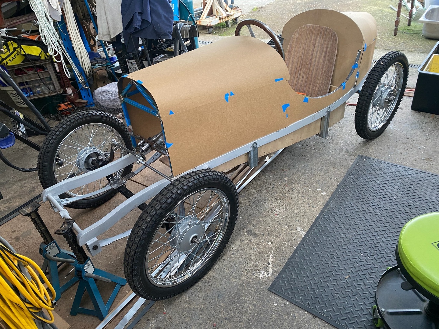 Finally starting to look at the body of the kart. This is where it's really starting to look like something. Cardboard patterns for the panels were made and fitted to the kart. The sides of the 'bonnet' are separate to the top panel of the bonnet. We need the sides to be removable to allow servicing of the foot pedals.