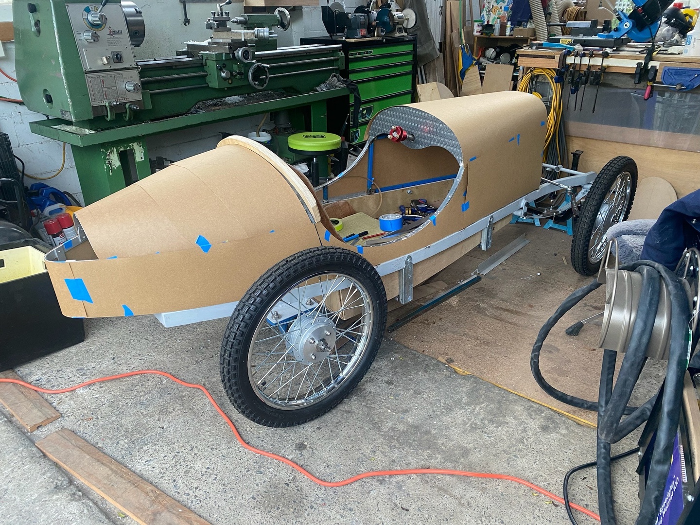 Finally starting to look at the body of the kart. This is where it's really starting to look like something. Cardboard patterns for the panels were made and fitted to the kart. The sides of the 'bonnet' are separate to the top panel of the bonnet. We need the sides to be removable to allow servicing of the foot pedals.