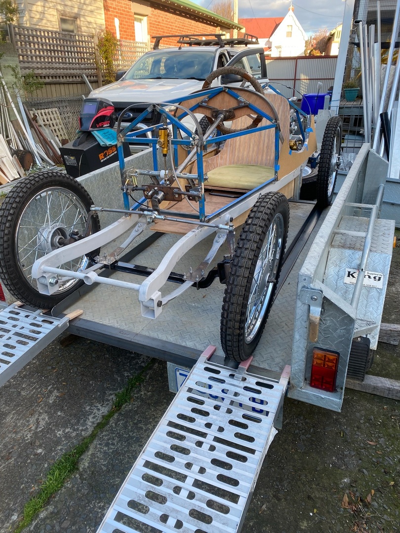 Before the bodywork is progressed too far, we thought it would be a good idea to run the kart and test it out. We decided that the best approach would be to fit a frame into the trailer that will locate the kart wheels and also provide tie down points. The frame was built out of angle iron with some fittings built in so the frame can be clamped onto the trailer without the trailer needing to be modified. We are probably using too many tie down straps, but the kart does not move when being trailered.