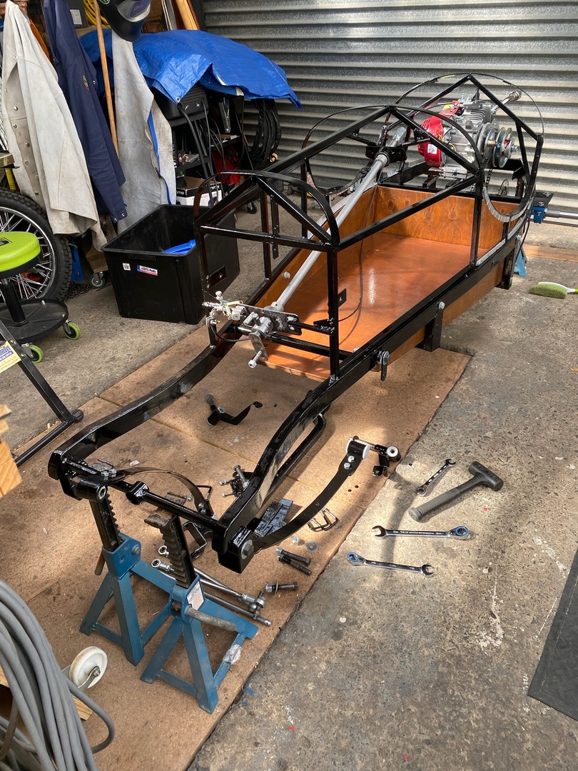 With the bodywork getting close and having decided there aren't any serious changes required to the running gear, it was time to disassemble the kart so the chassis and floor pan can be finished. Steelwork was finished in black enamel and the wooden floor pan got a coat of tinted varnish. After finishing, the kart is looking nice and clean. Ready for body work.