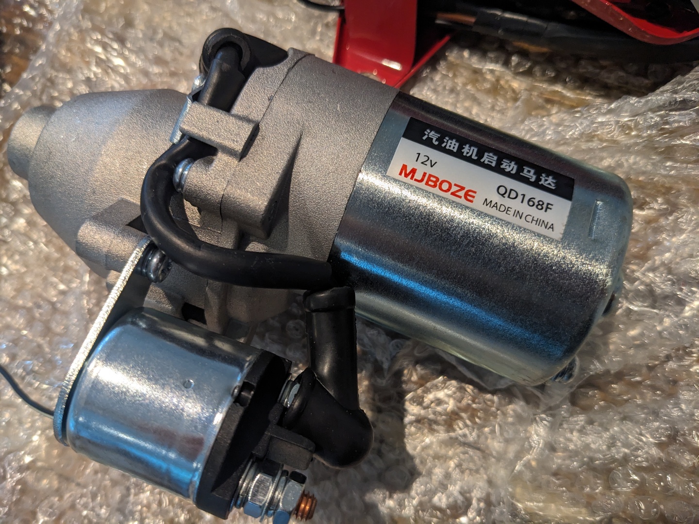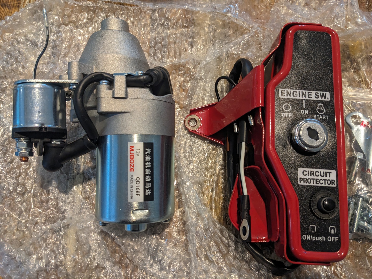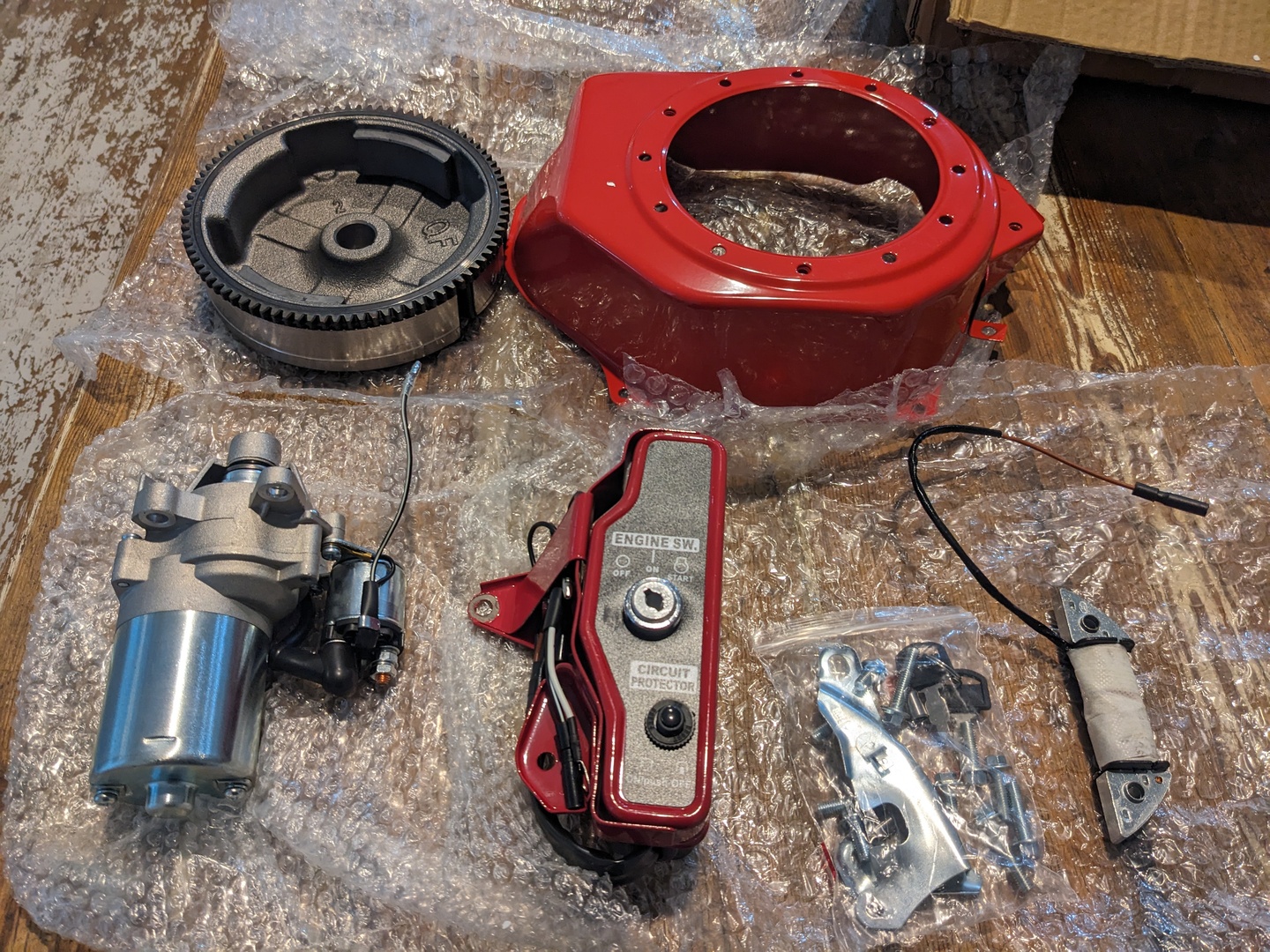 The kit looks straightforwards enough, but doesn't come with any documentation. It includes a new flywheel, flywheel cover, starter motor, control box and magneto. I need to dig out the engine to take a look at how it all goes together and maybe find some documentation online.