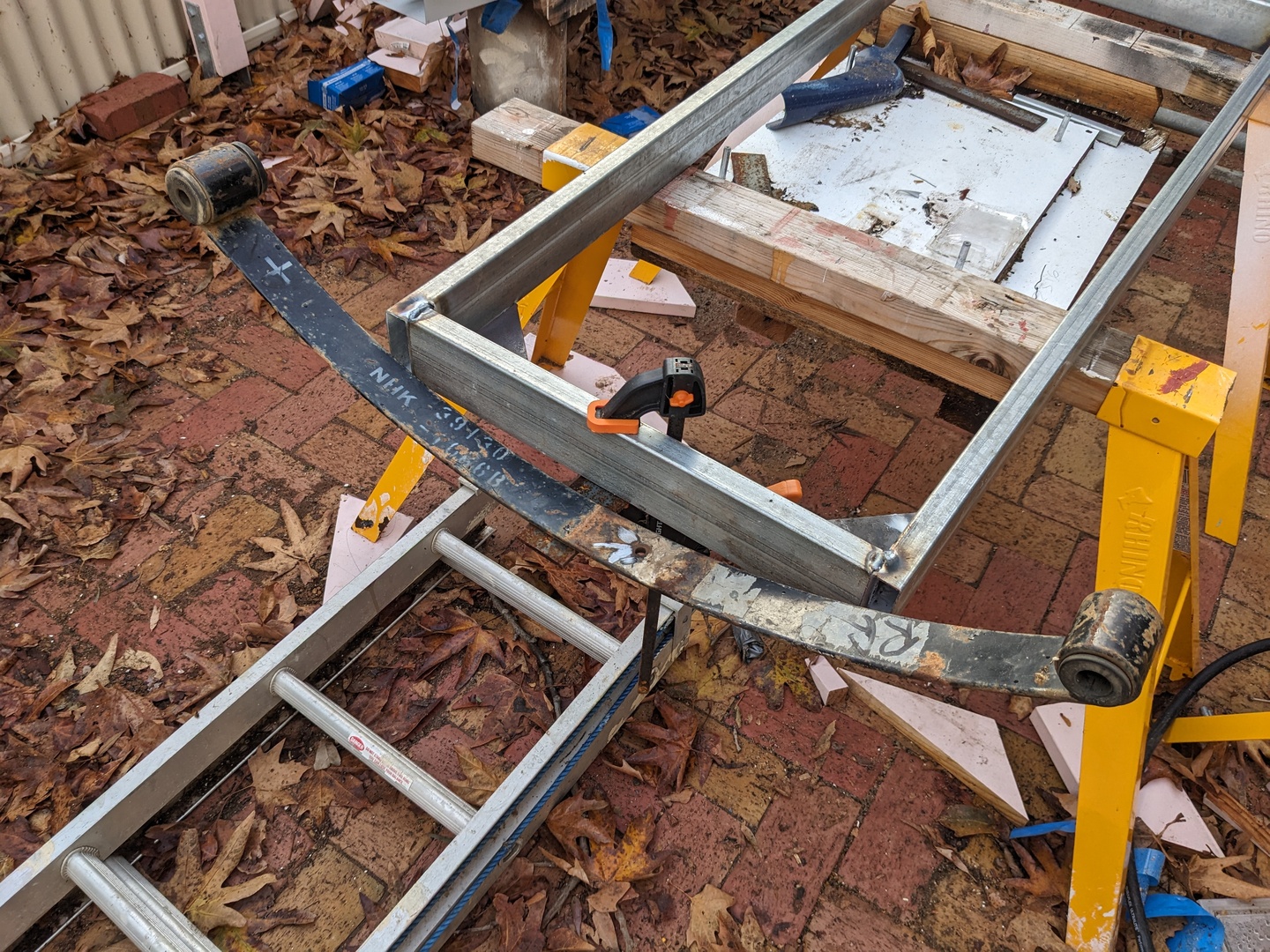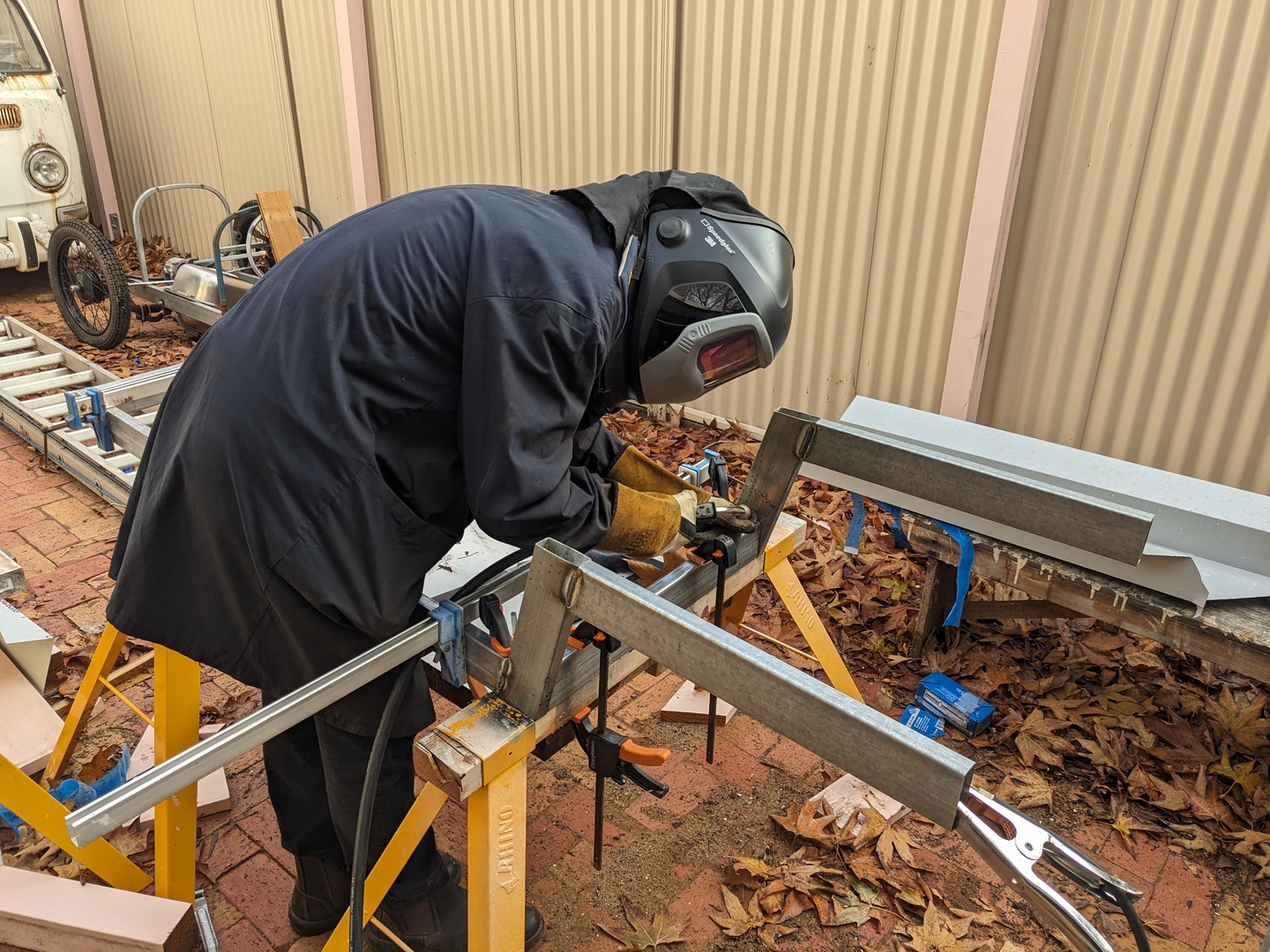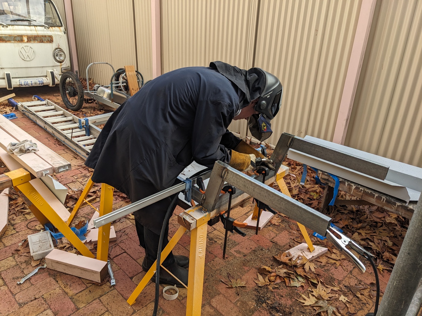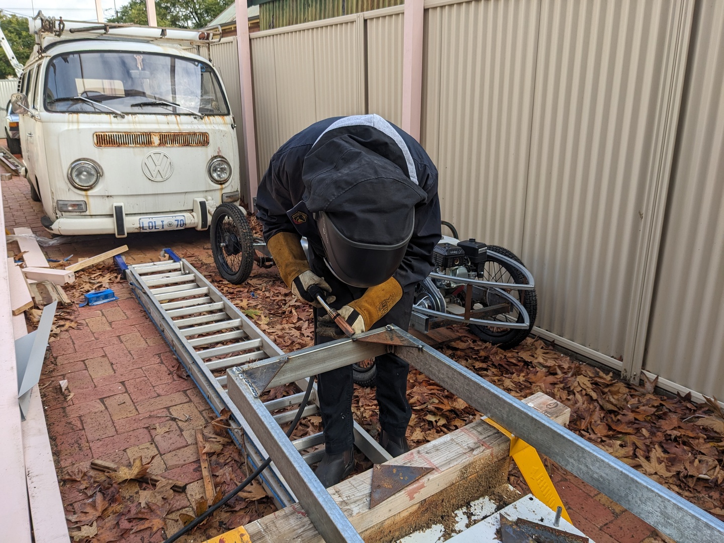 The rain held off today so spent some time today getting the chassis welded up. We decided on the chassis width based on the width of the rear axle, my CK and the width of the front spring. It is 50mm wider than my CK. After we levelled up the trestles, Locke checked the chassis for square and tacked it up. We added some gussets to the front corners to help improve the strength, as there will be a lot of twisting force from the transverse front spring.
