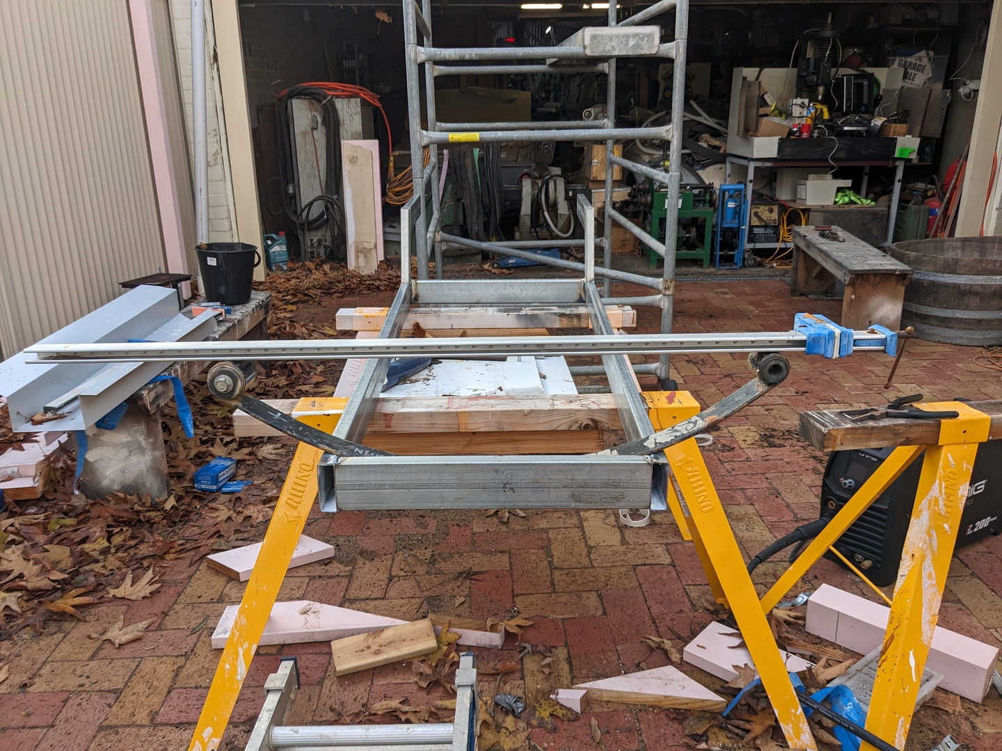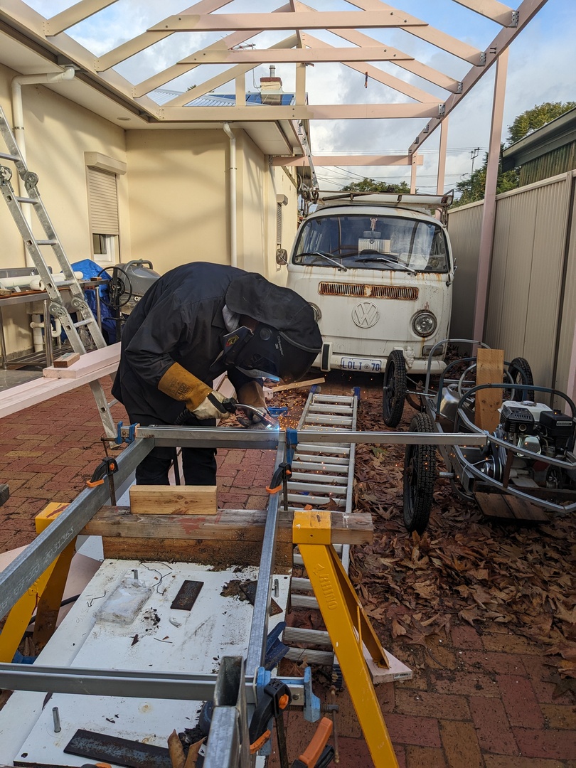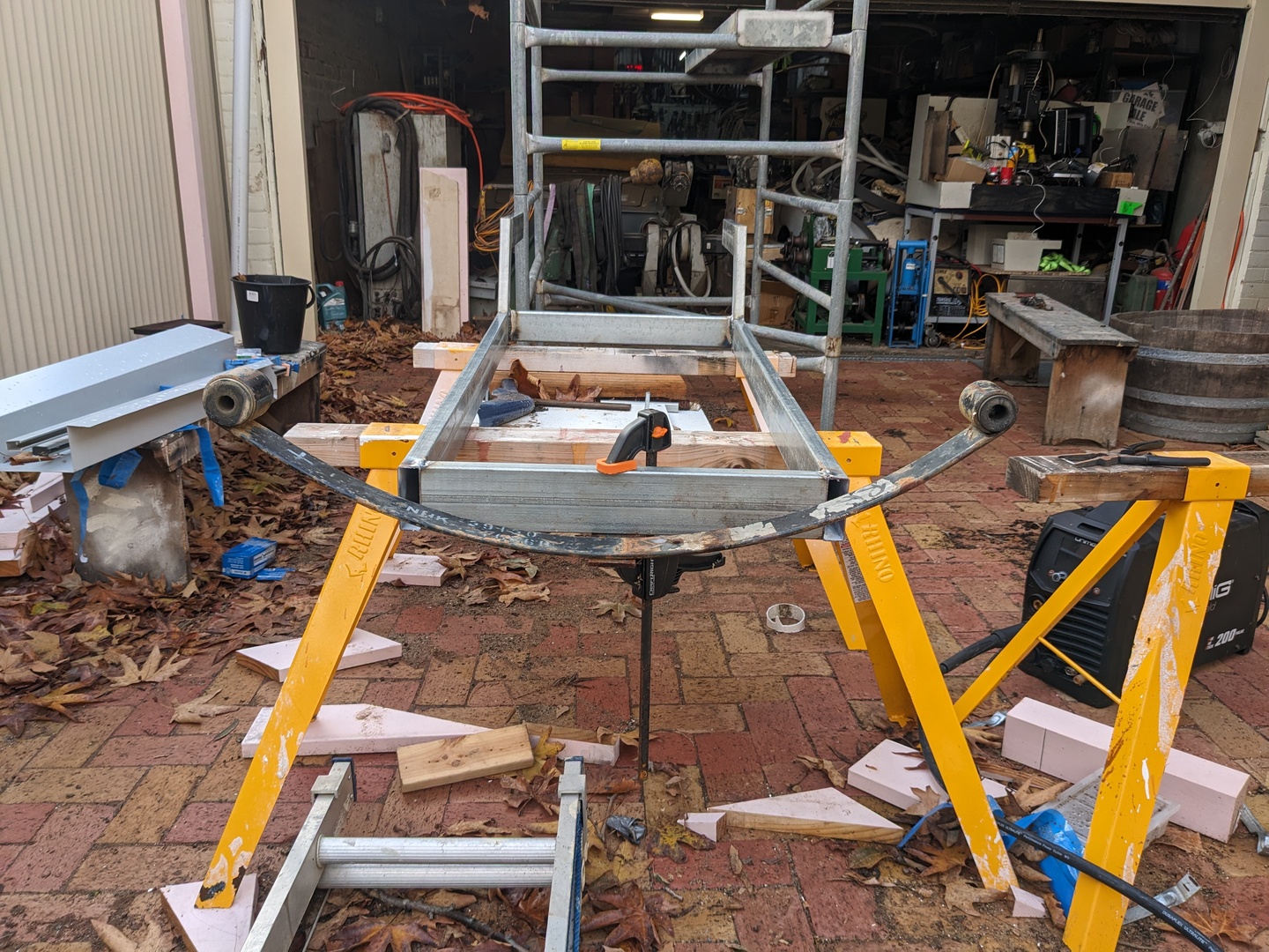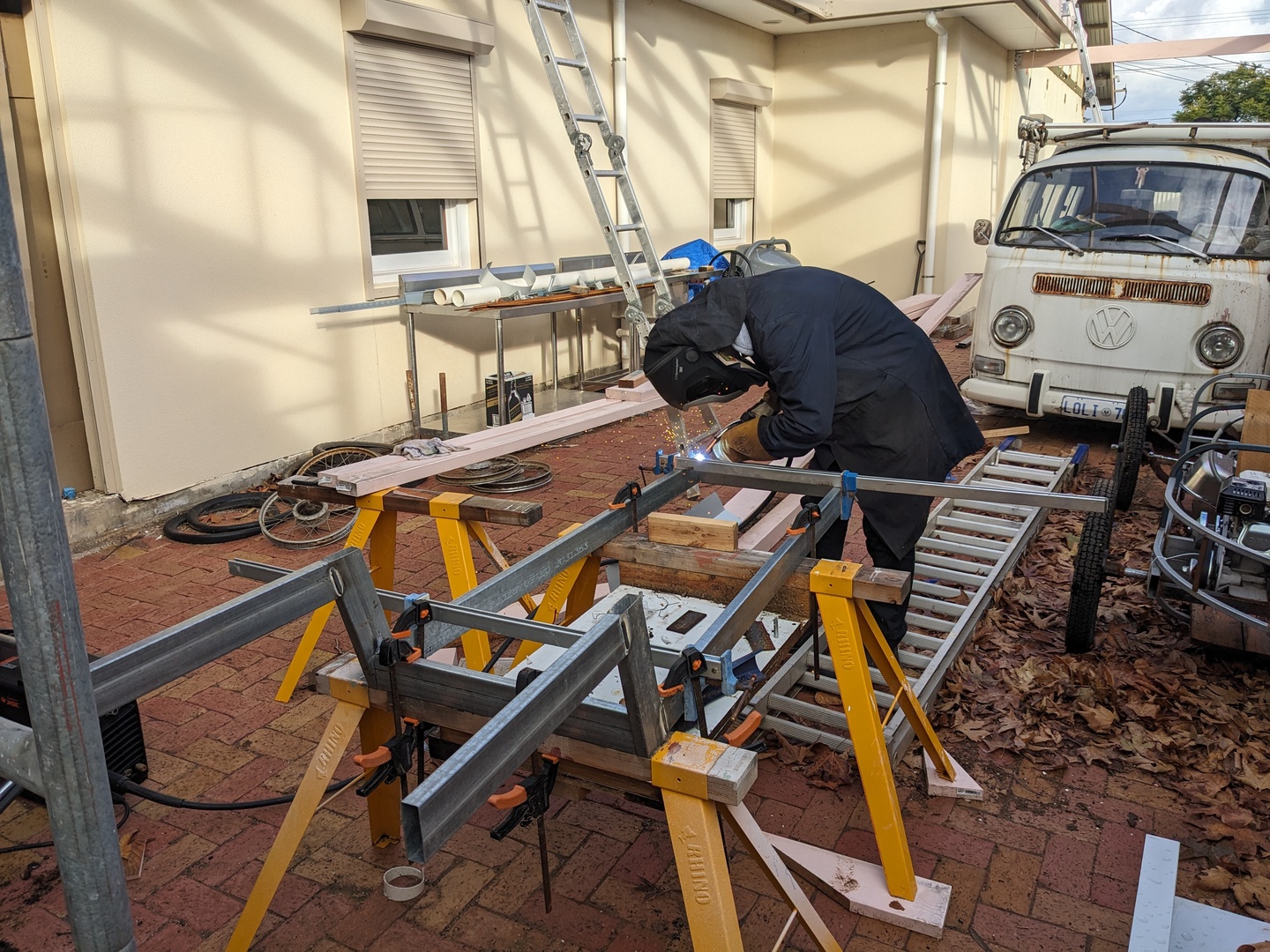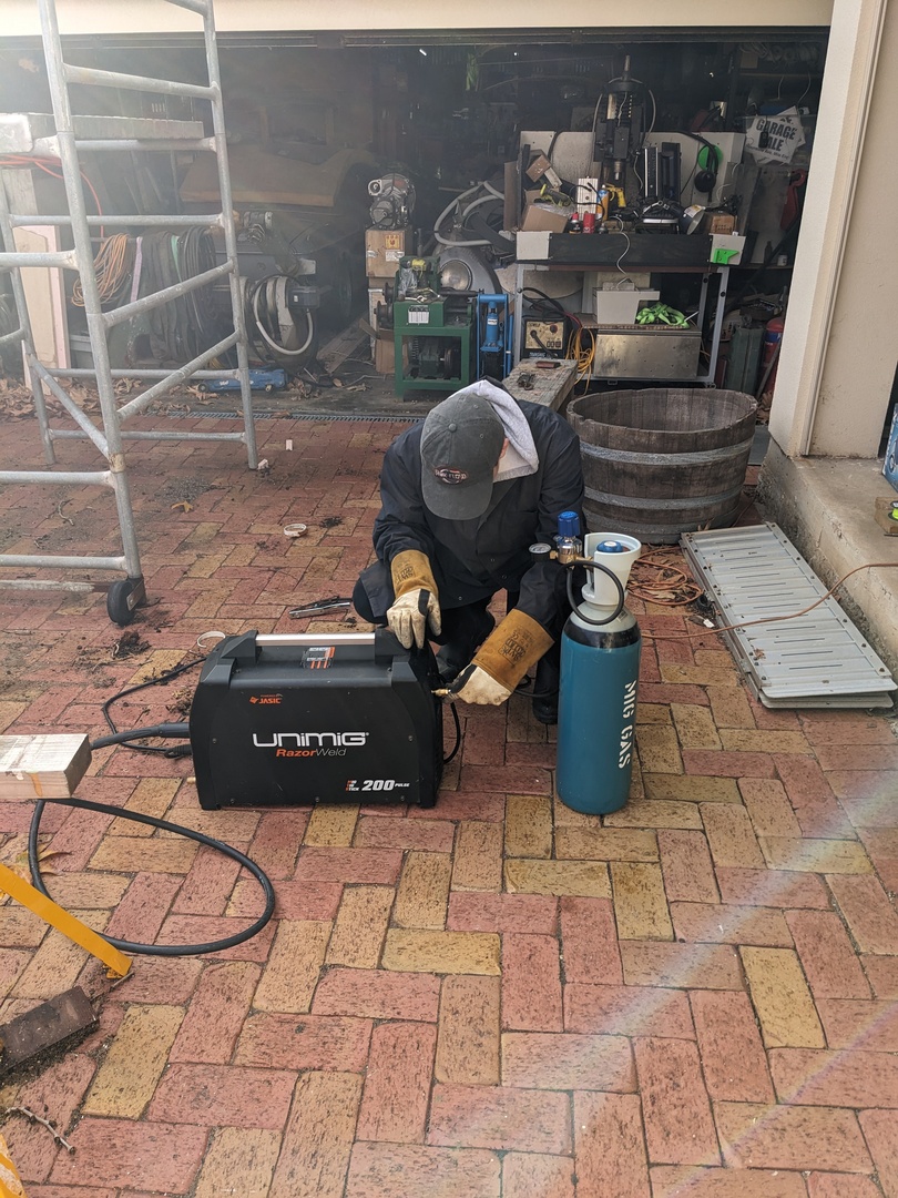 The rain held off today so spent some time today getting the chassis welded up. We decided on the chassis width based on the width of the rear axle, my CK and the width of the front spring. It is 50mm wider than my CK. After we levelled up the trestles, Locke checked the chassis for square and tacked it up. We added some gussets to the front corners to help improve the strength, as there will be a lot of twisting force from the transverse front spring.