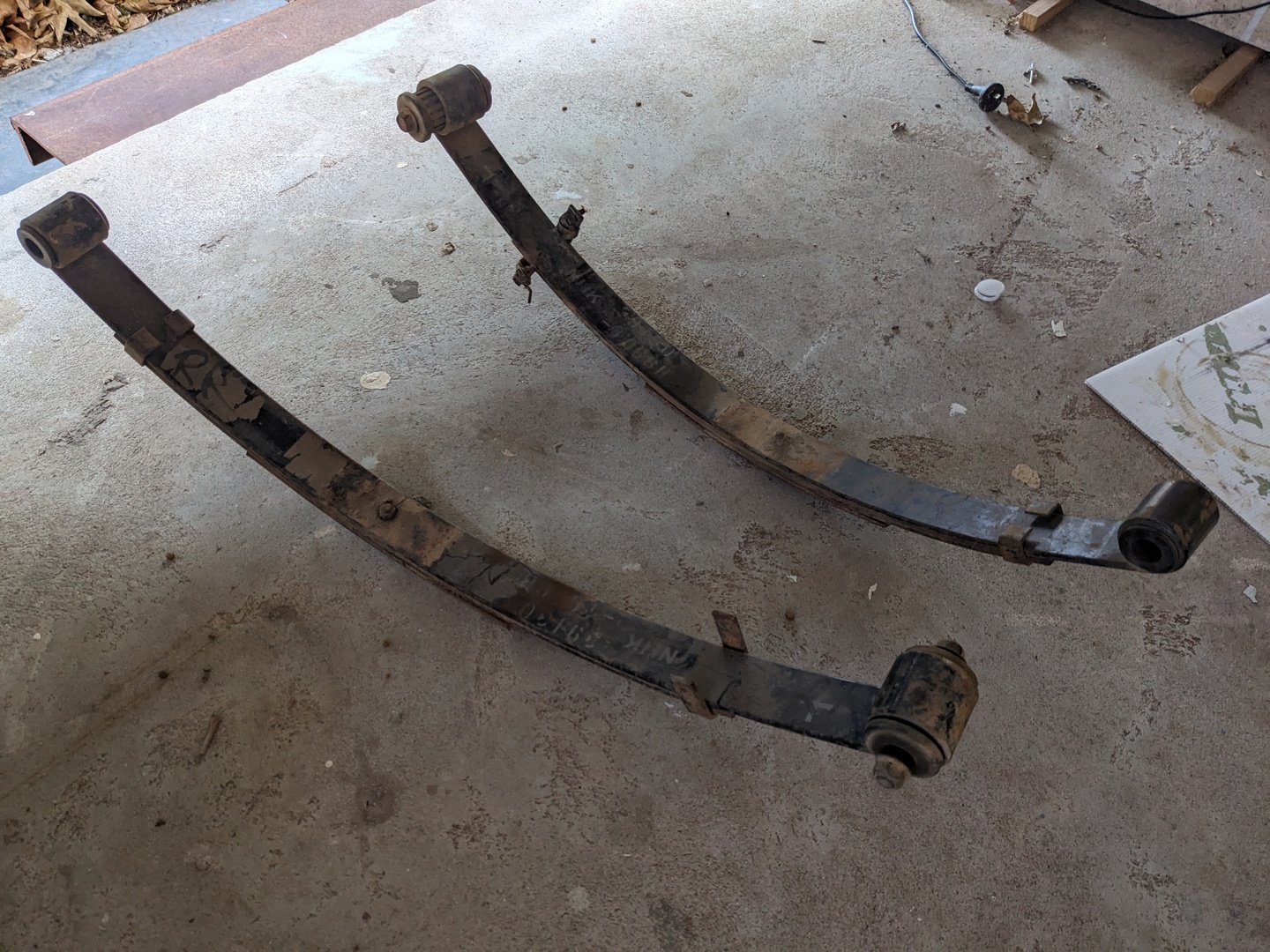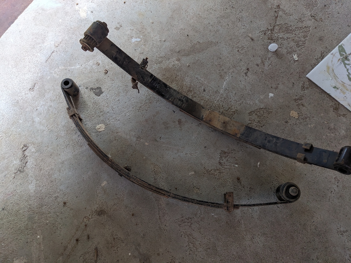 Found these springs from a Kawasaki Mule and thought they might work for a Cyclekart. Unfortunately the eye-to-eye distance is a little long at 750mm. Material is 6x50mm so also a little too heavy duty. They have three leaves, two of which are usable. I'm figuring that I can weld some mounting eyes to the second leaves which are 600mm long to make another pair of springs. The longer springs could be chopped down and used as 1/4 ellipticals on another build.