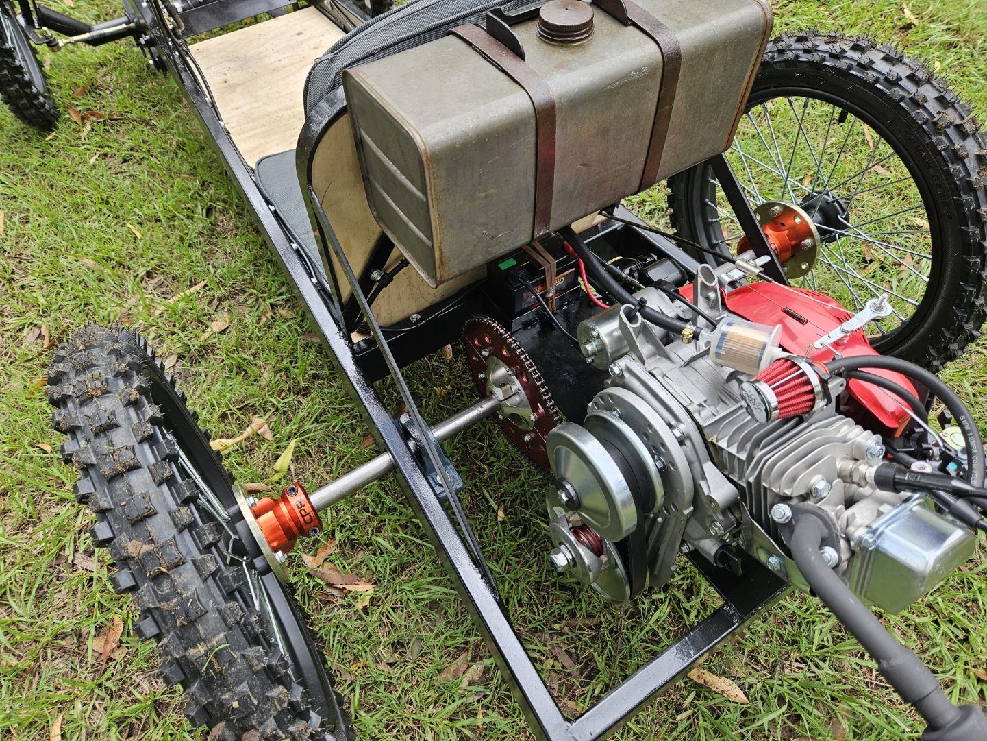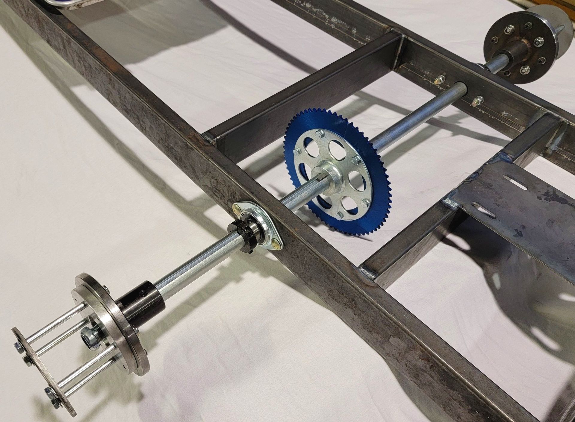 The rear axle is one of the more complex aspects of building a CycleKart. Not only does it have to somehow mount the wheels, but it also needs to take drive from the engine and torque converter as well as provide braking and a parking brake. All of this whilst also being mounted into the chassis in some kind of bearing set up.