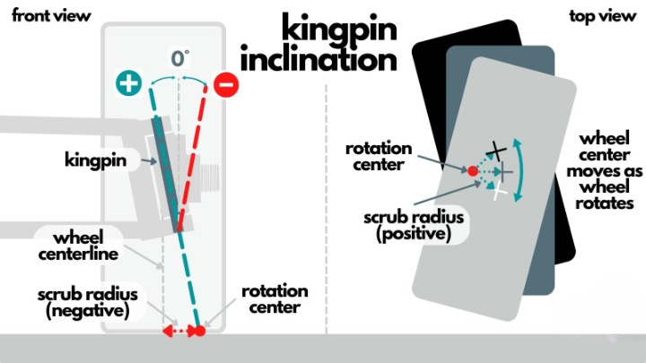 There is also a secondary action relating to the king pin inclination angle called scrub. This is the imaginary pivot point about which the wheels turn and is the point where an imaginary line drawn through the king pin hits the ground. If this point coincides with the centre of the tyre, it is known as a zero scrub radius. A zero scrub radius can make the handling squirrely and unstable in cornering. A positive scrub radius is where the point falls to the inside of the tyre contact patch and a negative scrub radius falls to the outside. Both will make the steering heavier / more stable. Generally aim to set the king pin inclination at about 7 degrees.
