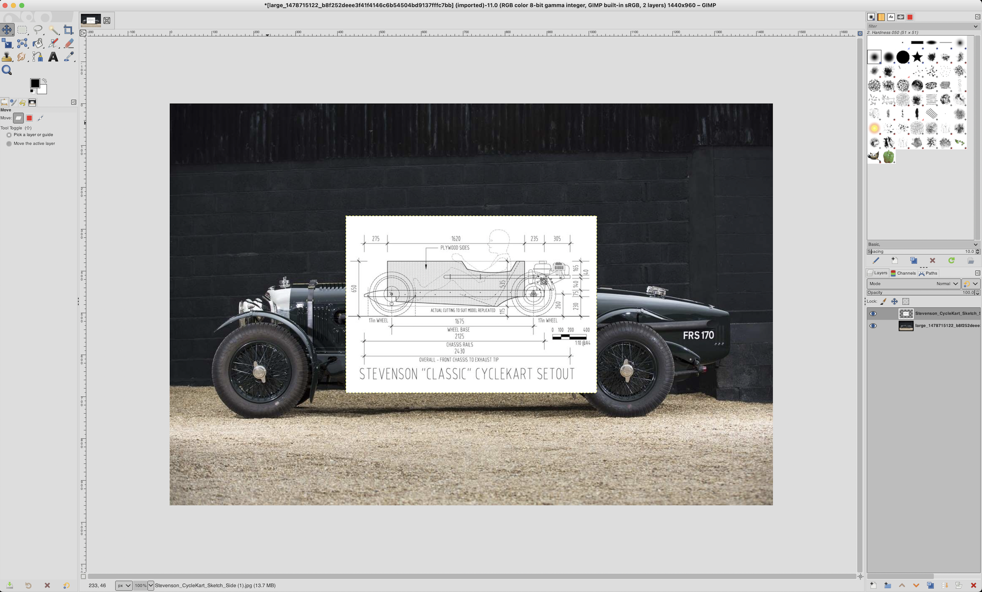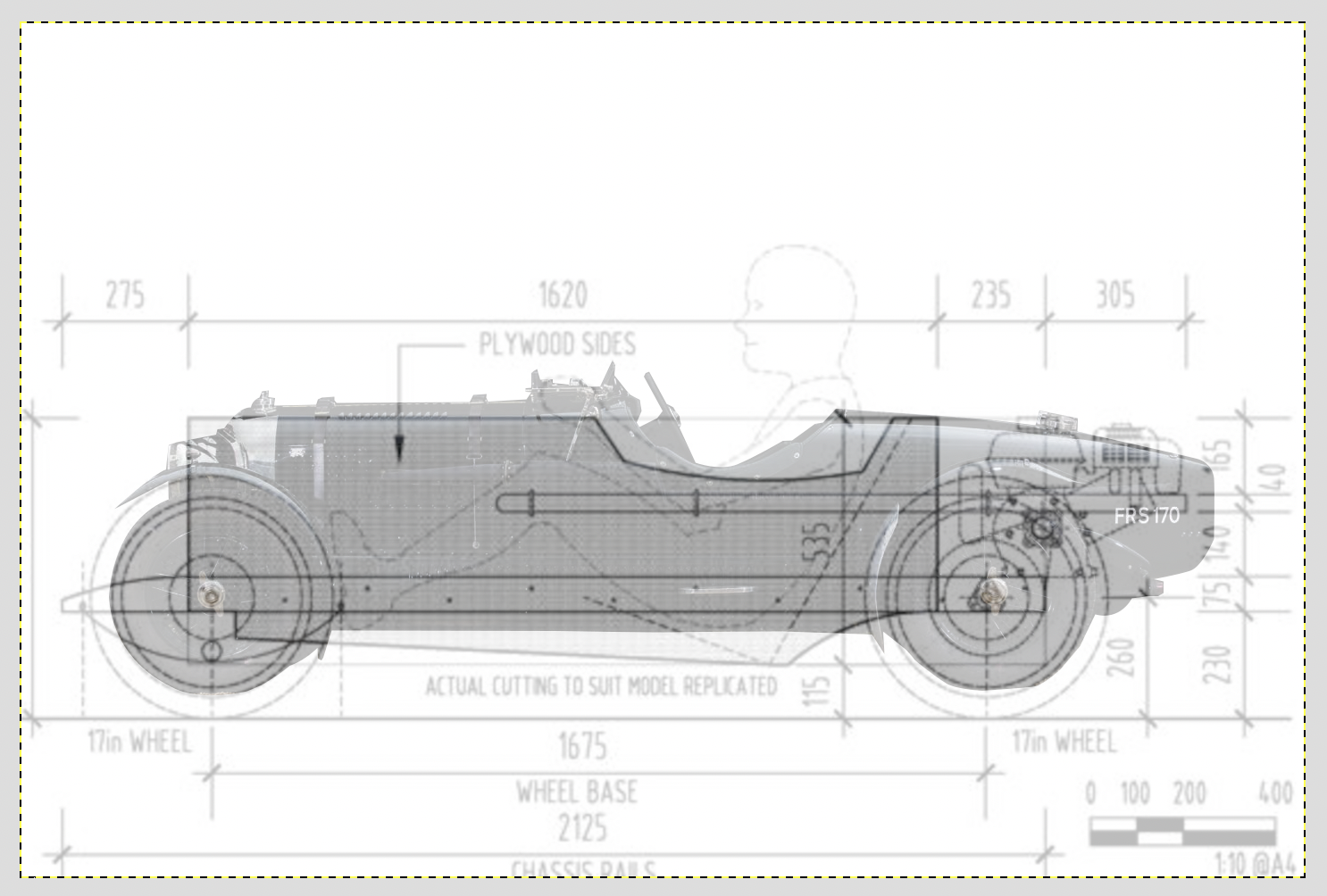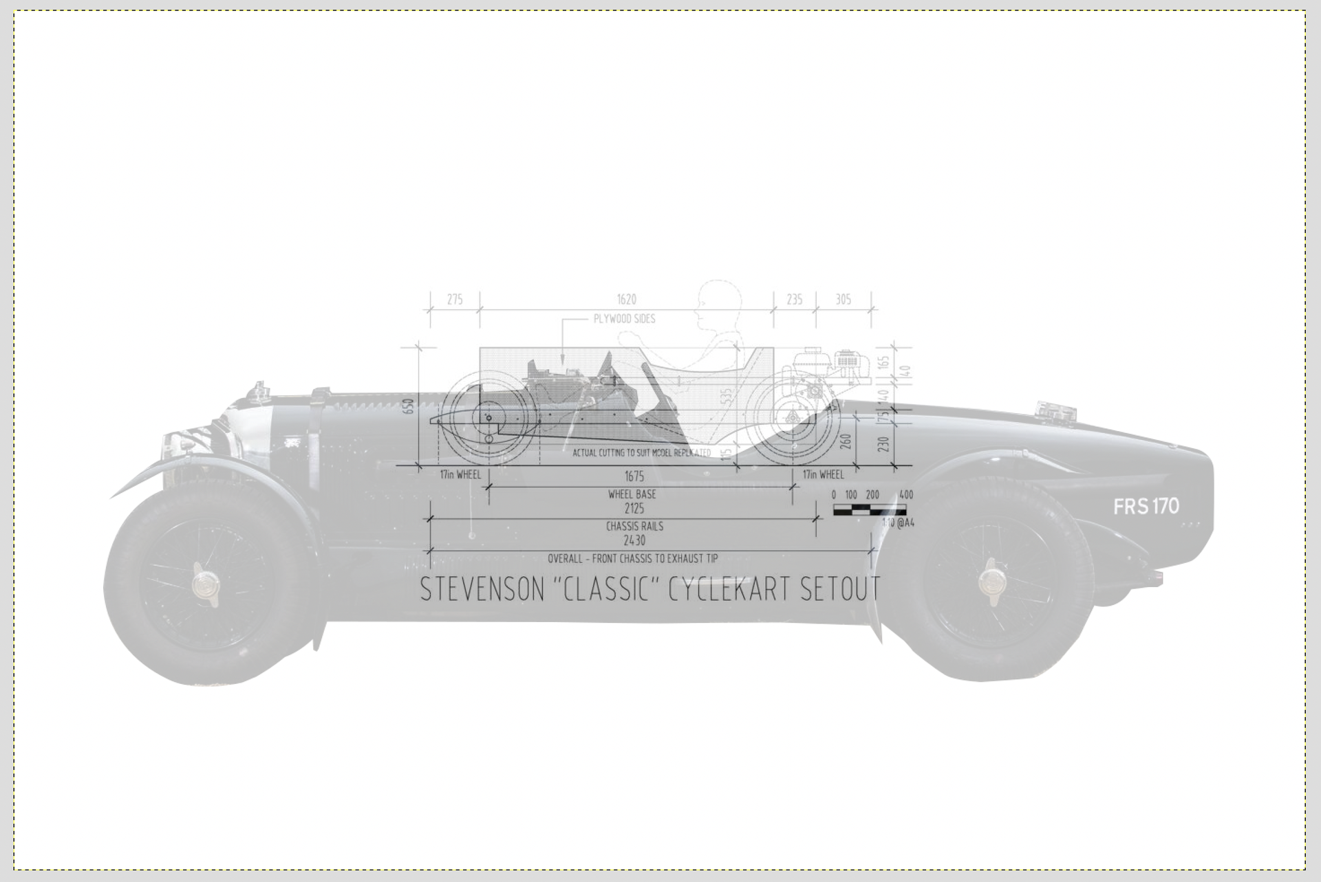 To determine the dimensions of your Cyclekart one method used is to overlay an image of your chosen inspiration car on top of the basic 'Stevenson Setout Diagram'. This will allow you to use the dimensions on the setout diagram.