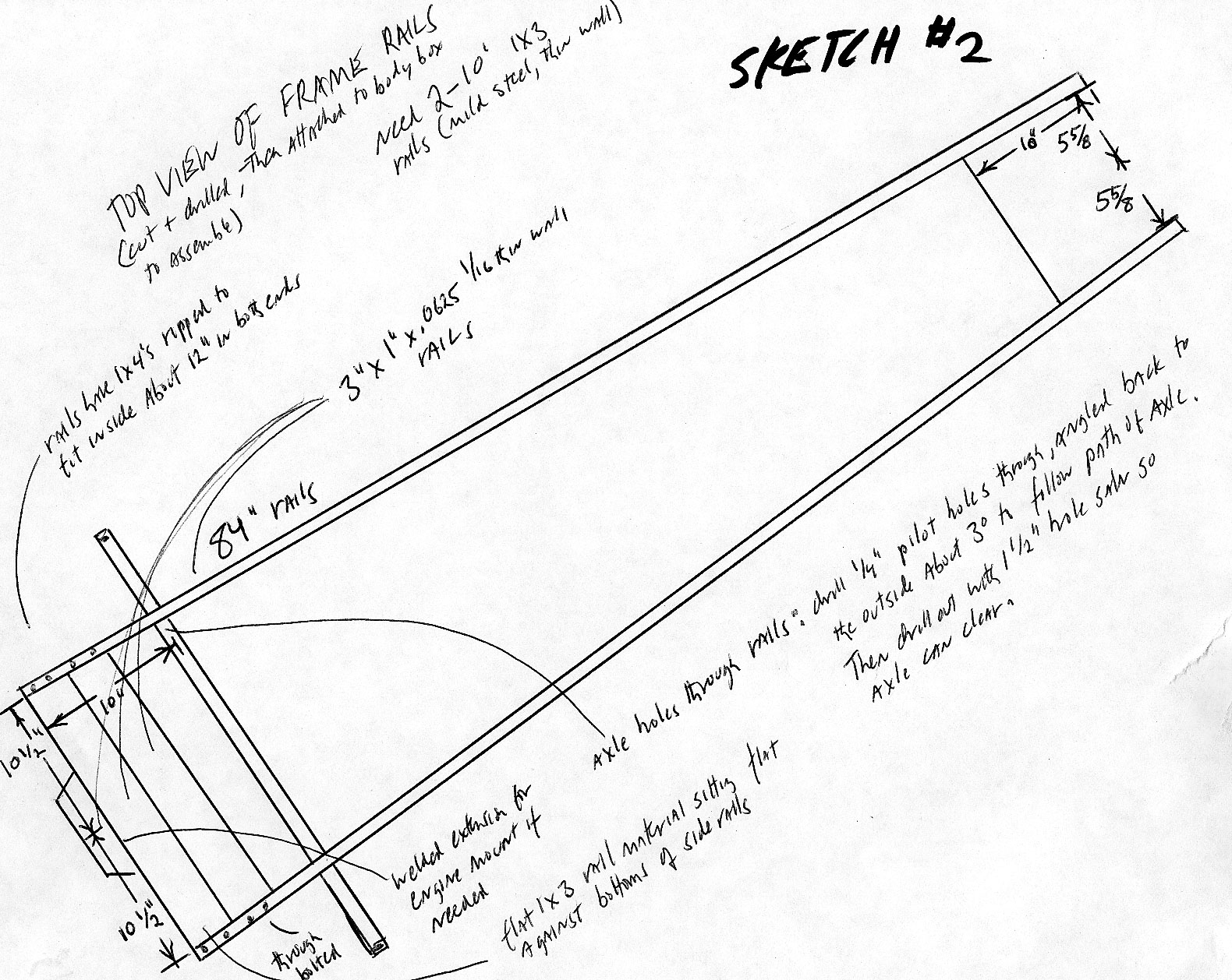 The classical CycleKart design is known as the 'Stevenson' design. This name is attributed to the guy(s) that originally created the design it and is the easiest style of cyclekart to build. It has straight chassis rails, welded together with a slight inward taper from the rear to the front. The passenger compartment is generally a plywood box that is bolts in-between the rails. The bodywork is an extension of this basic box in whatever style the owner is trying to achieve.